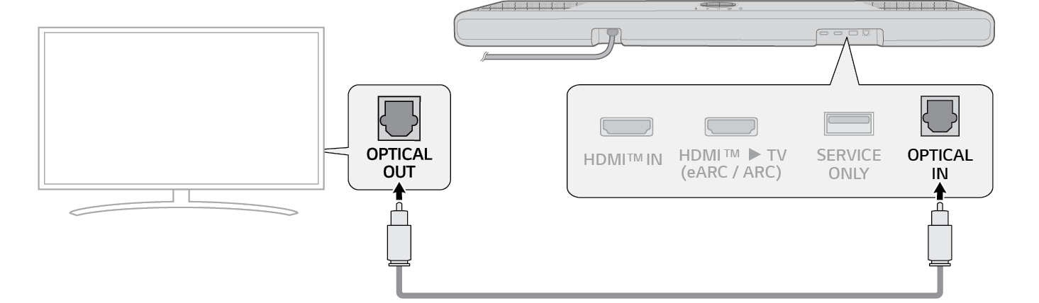 1. b Optista kaapelia käyttäen, yhdistä tuotteen takaosan OPTICAL IN -napa television Optinen digitaalilähtö (OPTICAL OUT) -napaan kuvan ohjeita avuksi käyttäen.