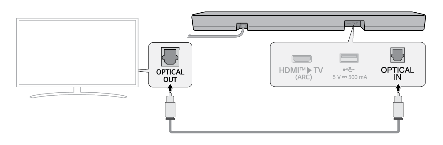 1. b Com um cabo ótico, ligue o terminal OPTICAL IN na parte traseira do produto ao terminal Saída digital ótica (OPTICAL OUT) na TV, conforme mostrado na imagem.