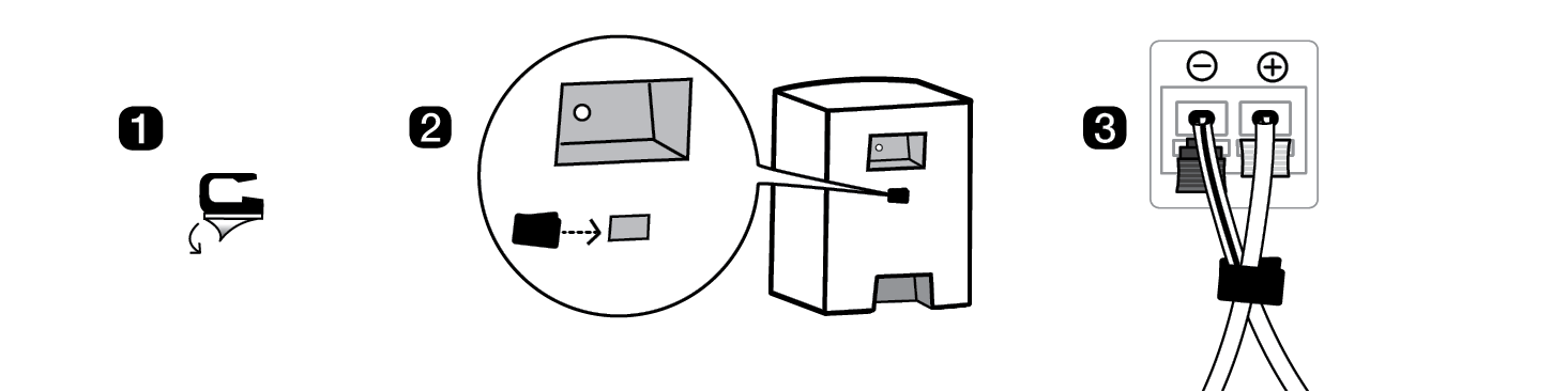 - a Anslut högtalarkablarna till motsvarande terminaler på de bakre högtalarna (vänster, höger). Anslut den svarta randiga kabeln till minusterminalen och den andra kabeln till plusterminalen.