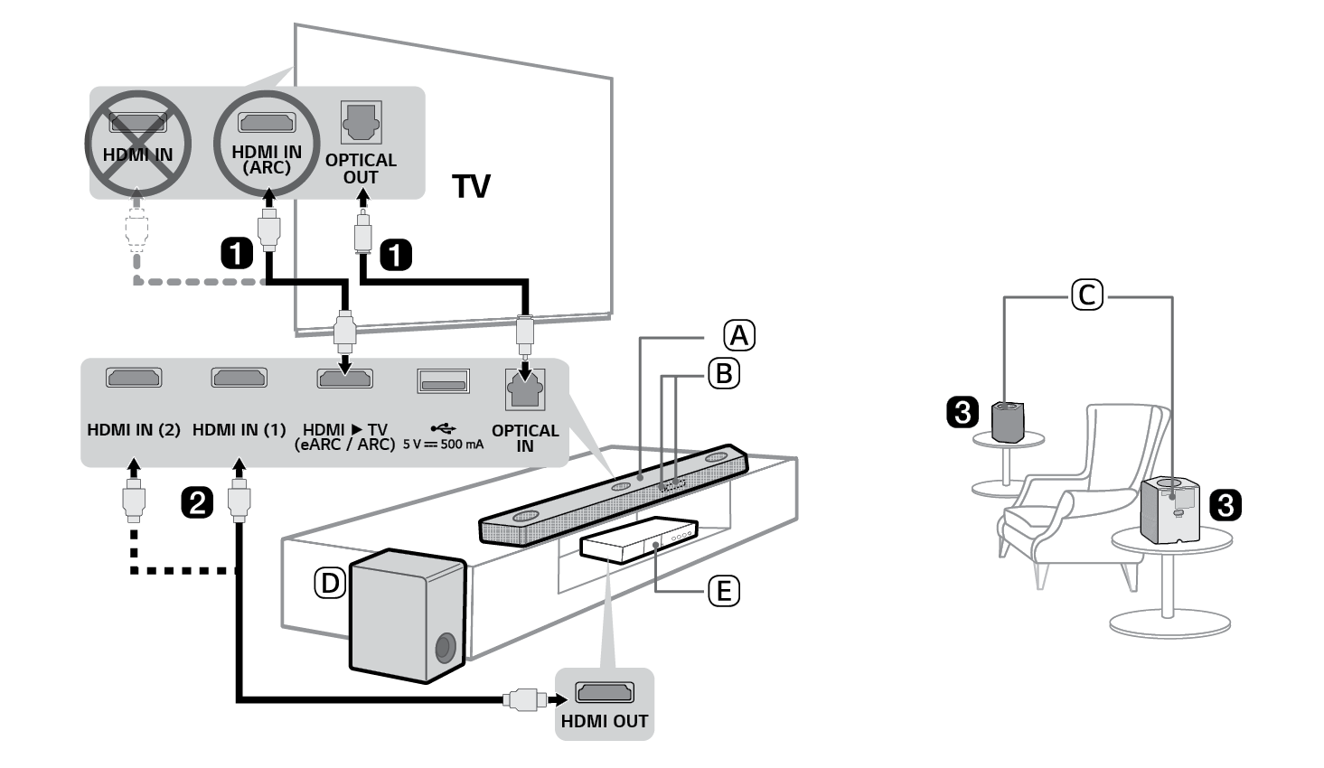 - D Trådløs Subwoofer - Installer den tæt på lydbjælken.
