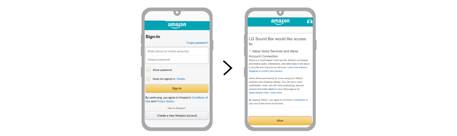 - a Uruchom aplikację LG Sound Bar i dotknij przycisk amazon alexa na pierwszym ekranie, a następnie postępuj zgodnie z poleceniami.