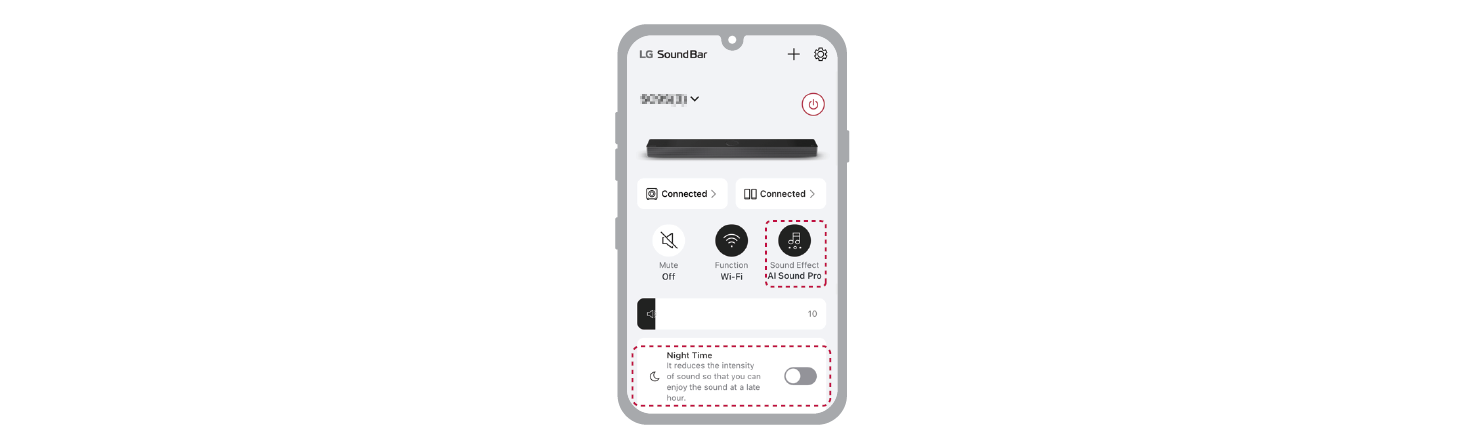 Spusťte aplikaci LG Sound Bar. Můžete snadno nastavit [Sound Effect] a [Night Time] a upravit úroveň každého reproduktoru bez dálkového ovládání.