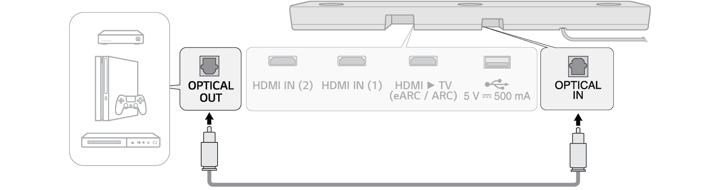 - a Utilizați cablul optic pentru a conecta terminalul OPTICAL IN de pe spatele produsului la terminalul OPTICAL OUT al dispozitivului dvs. extern (de ex., player TV, Blu-ray), conform imaginii.
