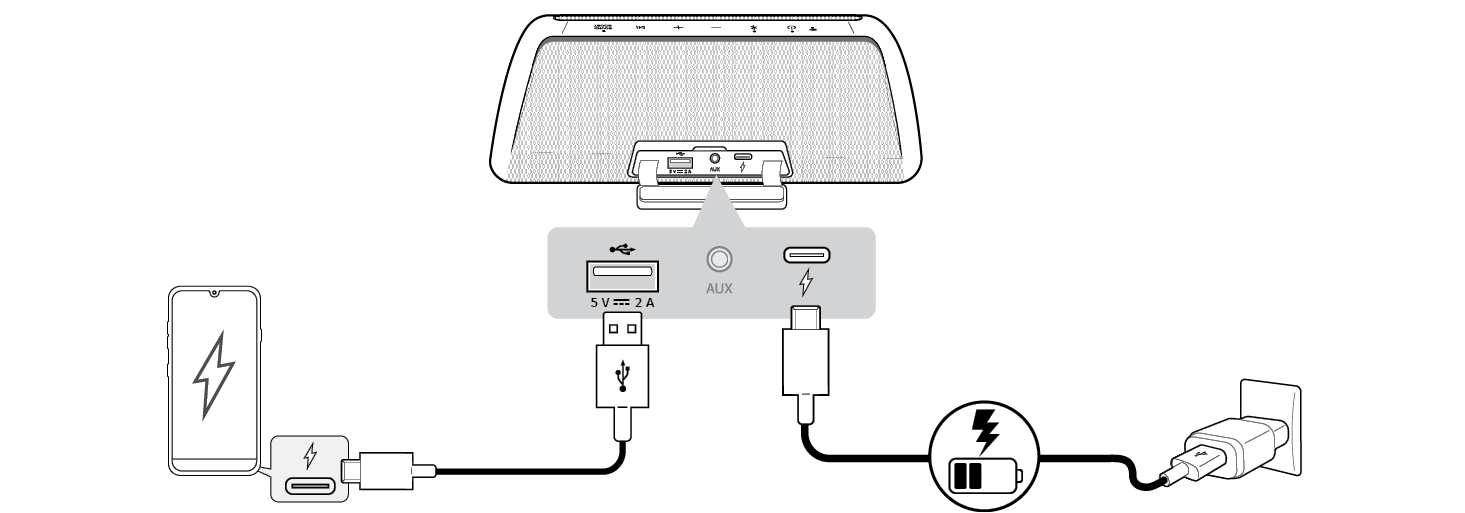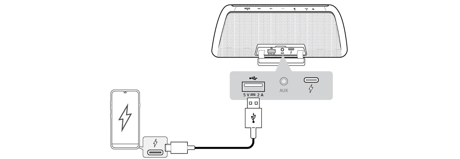 - b اعتمادًا على ما إذا كان مكبر الصوت يشحن أم لا، يمكن شحن الهاتف الذكي.