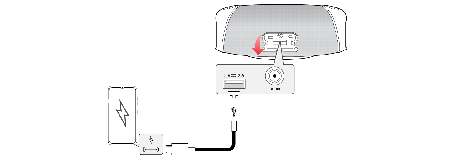 - a Nyissa fel a hangszóró hátsó fedelét, és csatlakoztassa az okostelefont az DC OUT (5 V 0 2 A) csatlakozóhoz az USB-kábellel. Az okostelefon töltése megkezdődik.