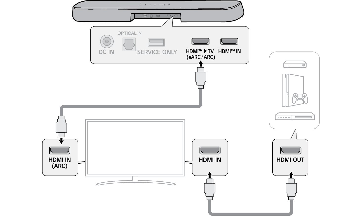Connect the TV and external device (game console, DVD player, etc.) with an HDMI cable and enjoy a deep and rich sound.