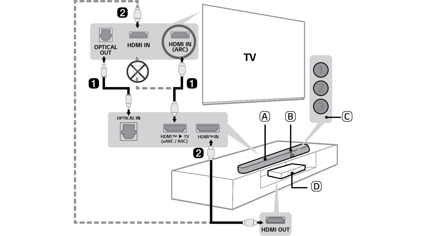 - a Koble lydplanken til din TV ved å bruke en optisk kabel eller en HDMI-kabel.