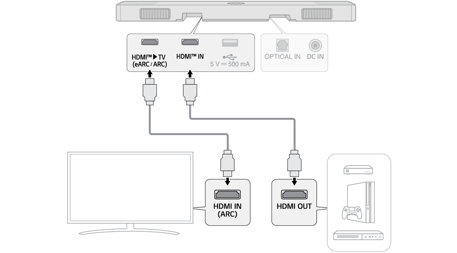 Conecte el televisor y el dispositivo externo (videoconsola, reproductor de DVD, etc.) con un cable HDMI y disfrute de un sonido profundo y rico.