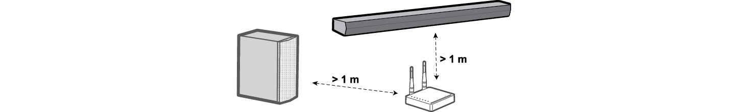 • Per evitar interferències sense fil, mantingueu una distància d’almenys 1 m entre la barra de so o l’altaveu de subgreus sense fil i qualsevol dispositiu perifèric que generi ones electromagnètiques potents (p. ex., encaminadors sense fil, forns microones, etc.).