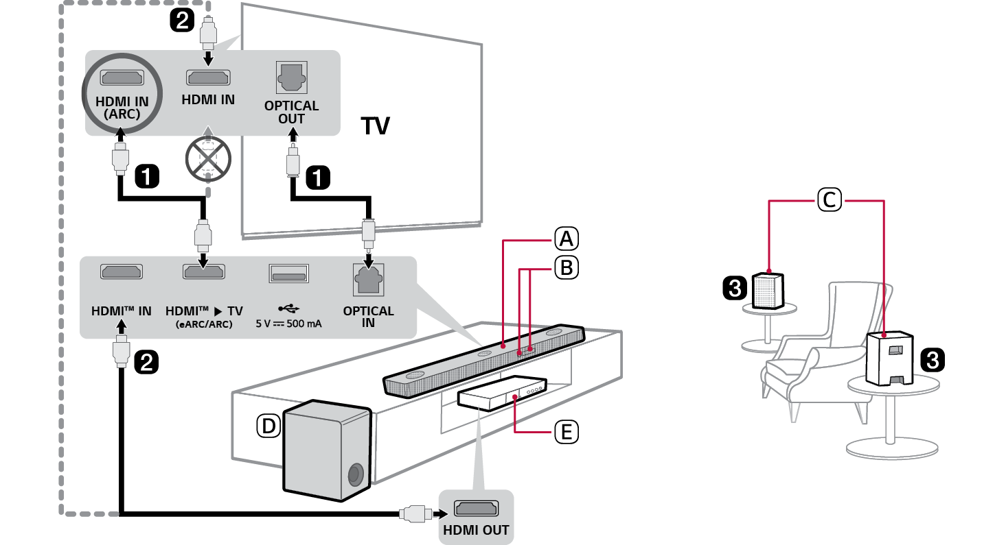 - C Quando il televisore è collegato correttamente al prodotto, nel visualizzatore dello stato appare “OPT”, “ARC” o “E-ARC”, e viene emesso un segnale acustico.