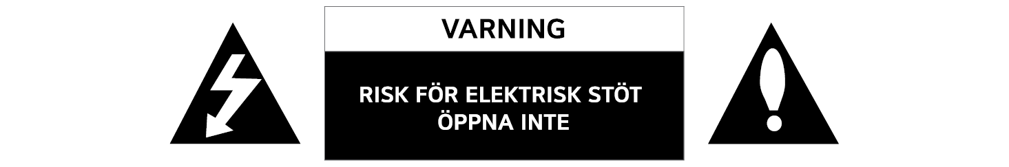 FÖRSIKTIGHET! FÖR ATT MINSKA RISKEN FÖR ELEKTRISKA STÖTAR BÖR DU INTE TA BORT HÖLJET (ELLER BAKSIDAN). DET FINNS INGA DELAR SOM DU (ANVÄNDAREN) KAN REPARERA SJÄLV. VID REPARATION VÄND DIG TILL KVALIFICERAD SERVICEPERSONAL.