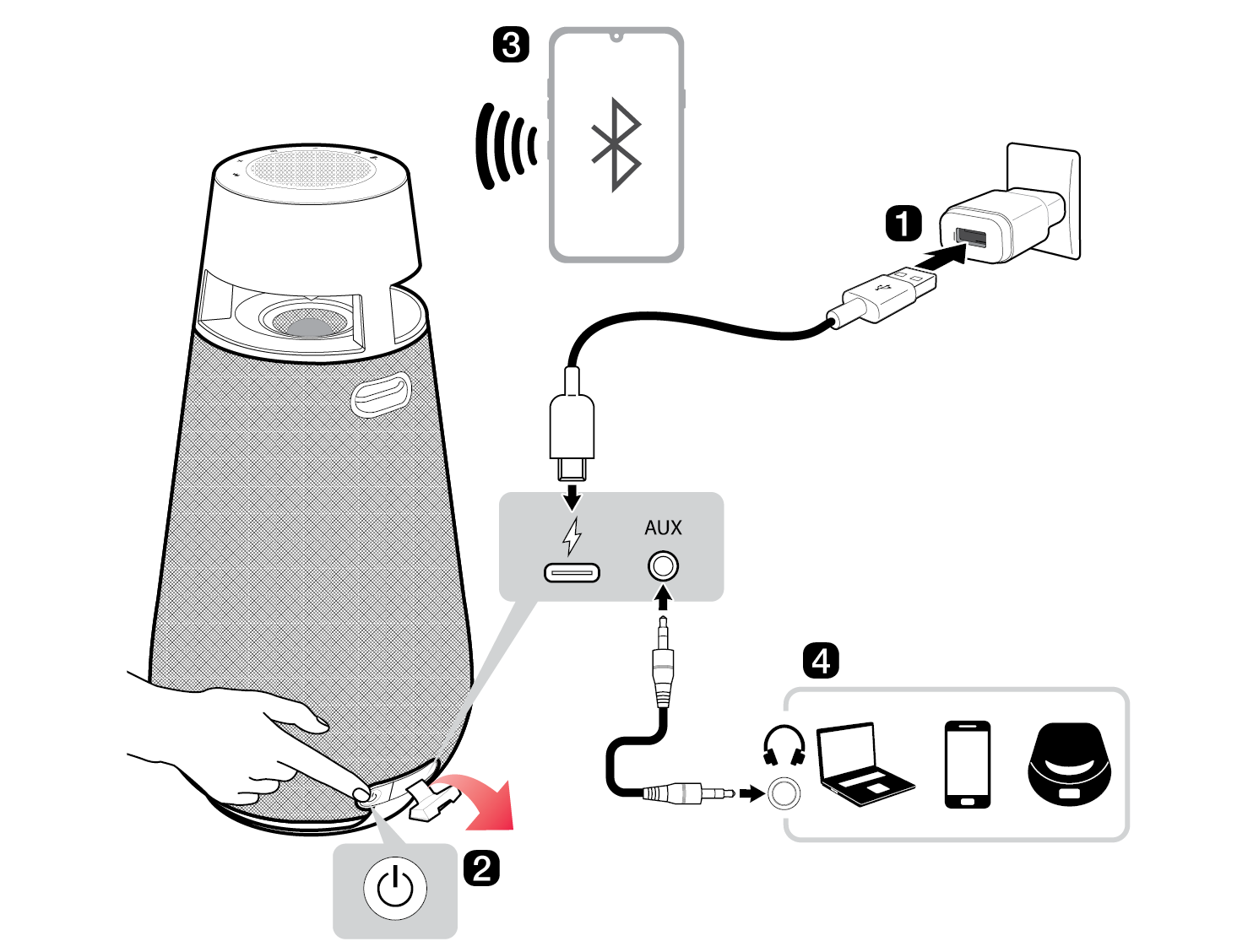 按钮,启动产品。 - B 打开产品后盖,通过 3.5 毫米的立体声音频线将外部设备连接到 AUX 端口。(产品在蓝牙和 AUX 功能切换时,需要重新拔出及插入产品端的立体声音频线。)